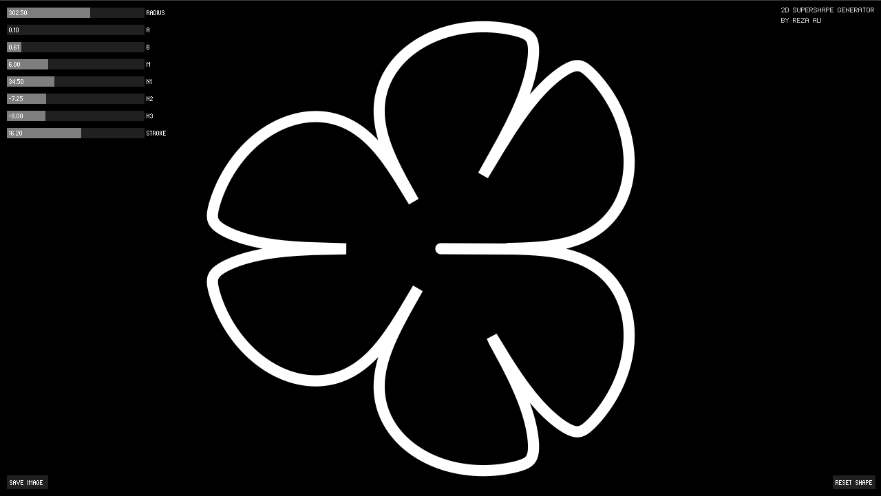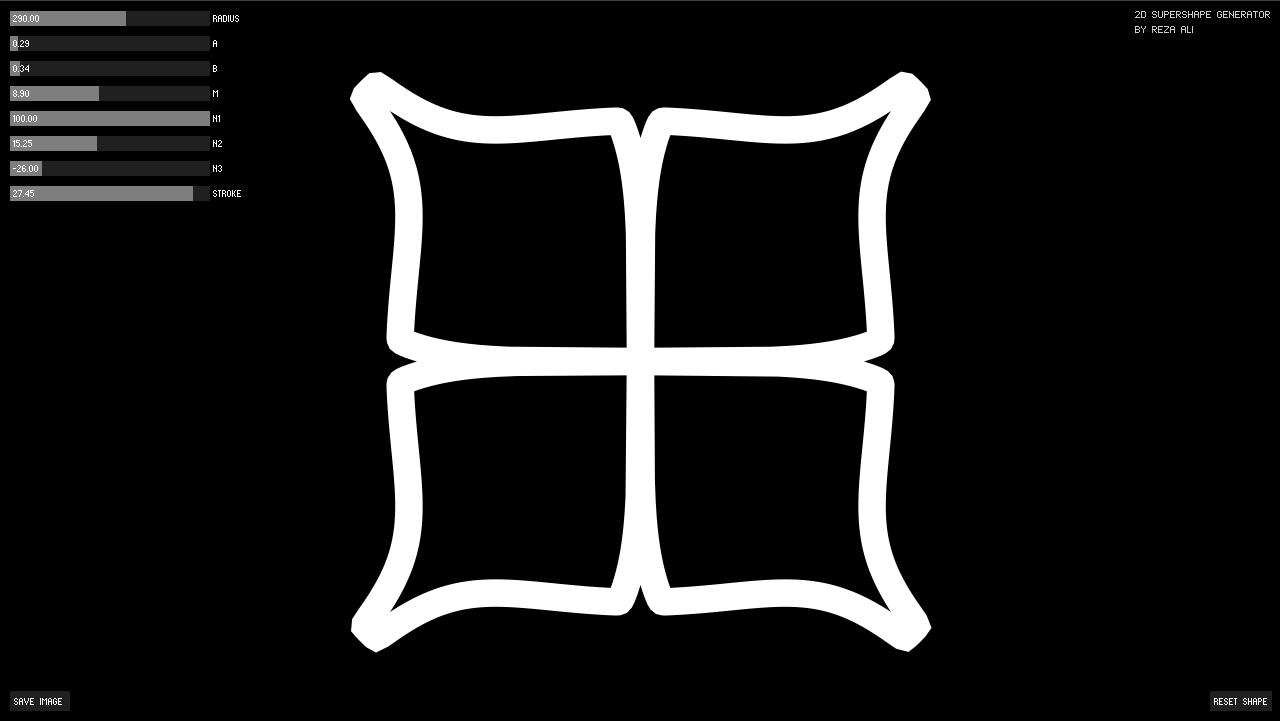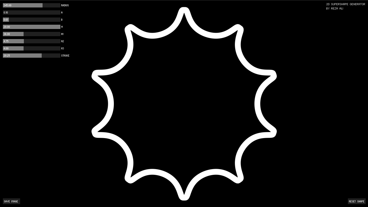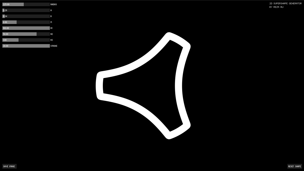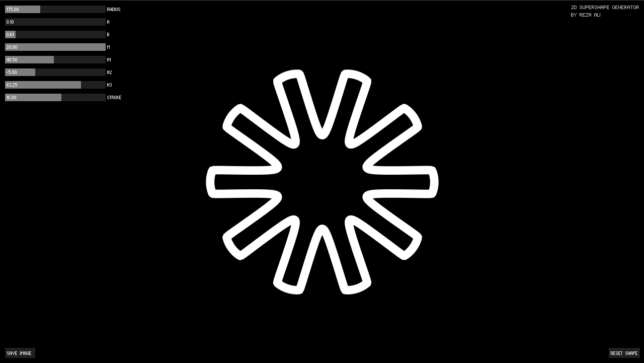 Super Shapes are intricate forms generated by evaluating the Superformula with varying input parameters. The Superformula produces visually stunning shapes that can be incorporated into more complex graphics or compositions (often seen in demoscene art). The application (shown below) is designed to be both interactive and minimal, allowing users to explore the diversity of these forms effortlessly.