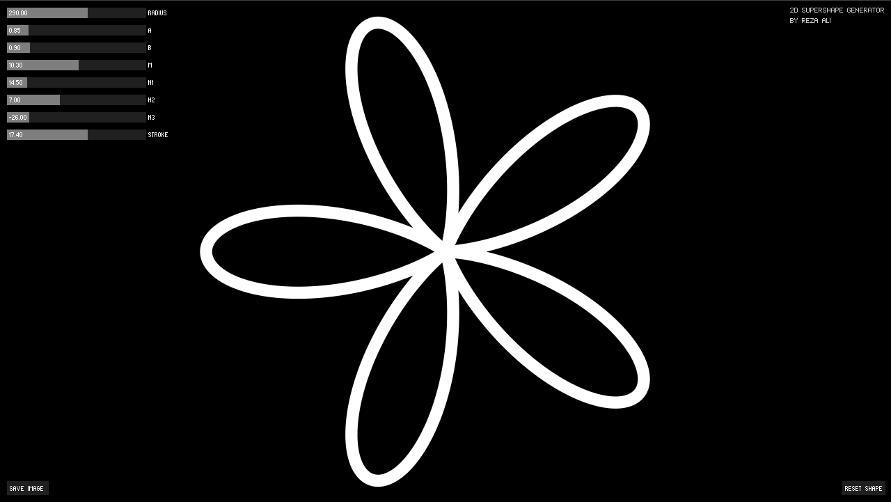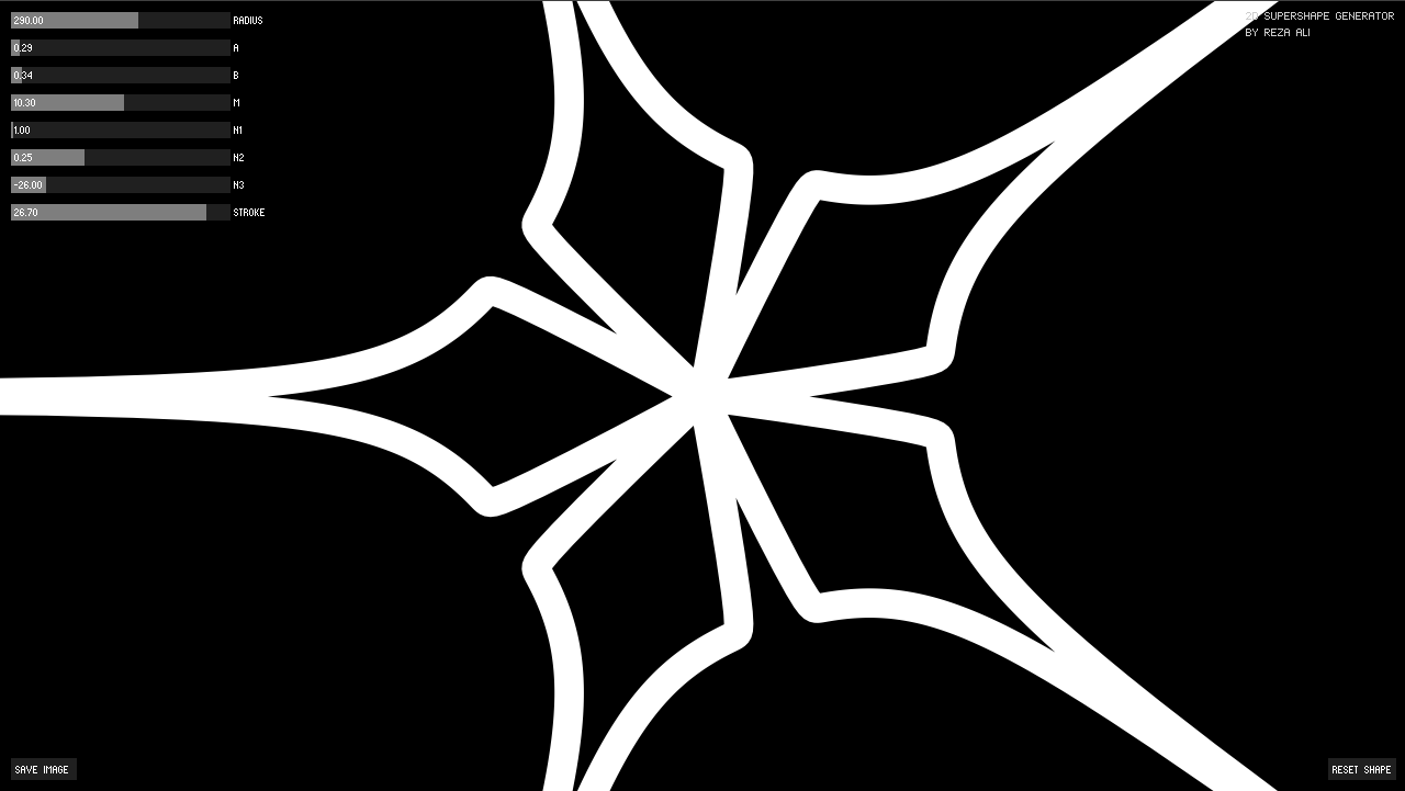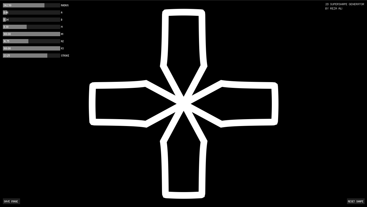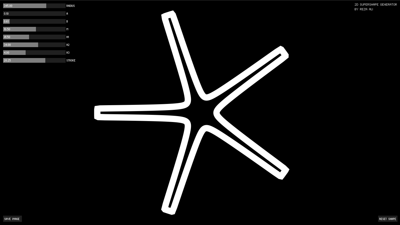 Super Shapes are intricate forms generated by evaluating the Superformula with varying input parameters. The Superformula produces visually stunning shapes that can be incorporated into more complex graphics or compositions (often seen in demoscene art). The application (shown below) is designed to be both interactive and minimal, allowing users to explore the diversity of these forms effortlessly.
