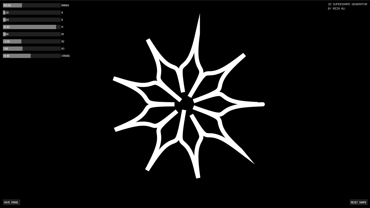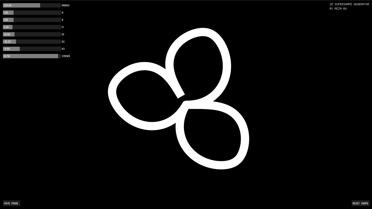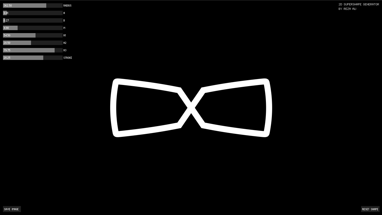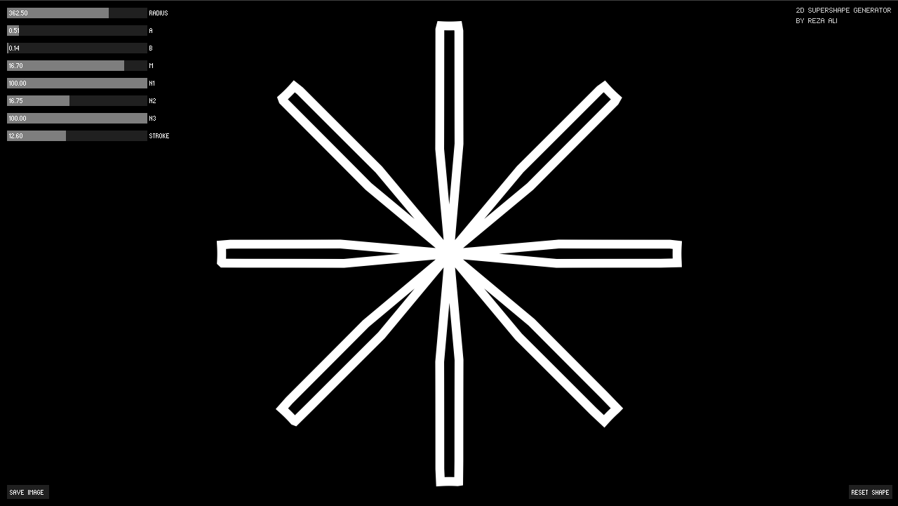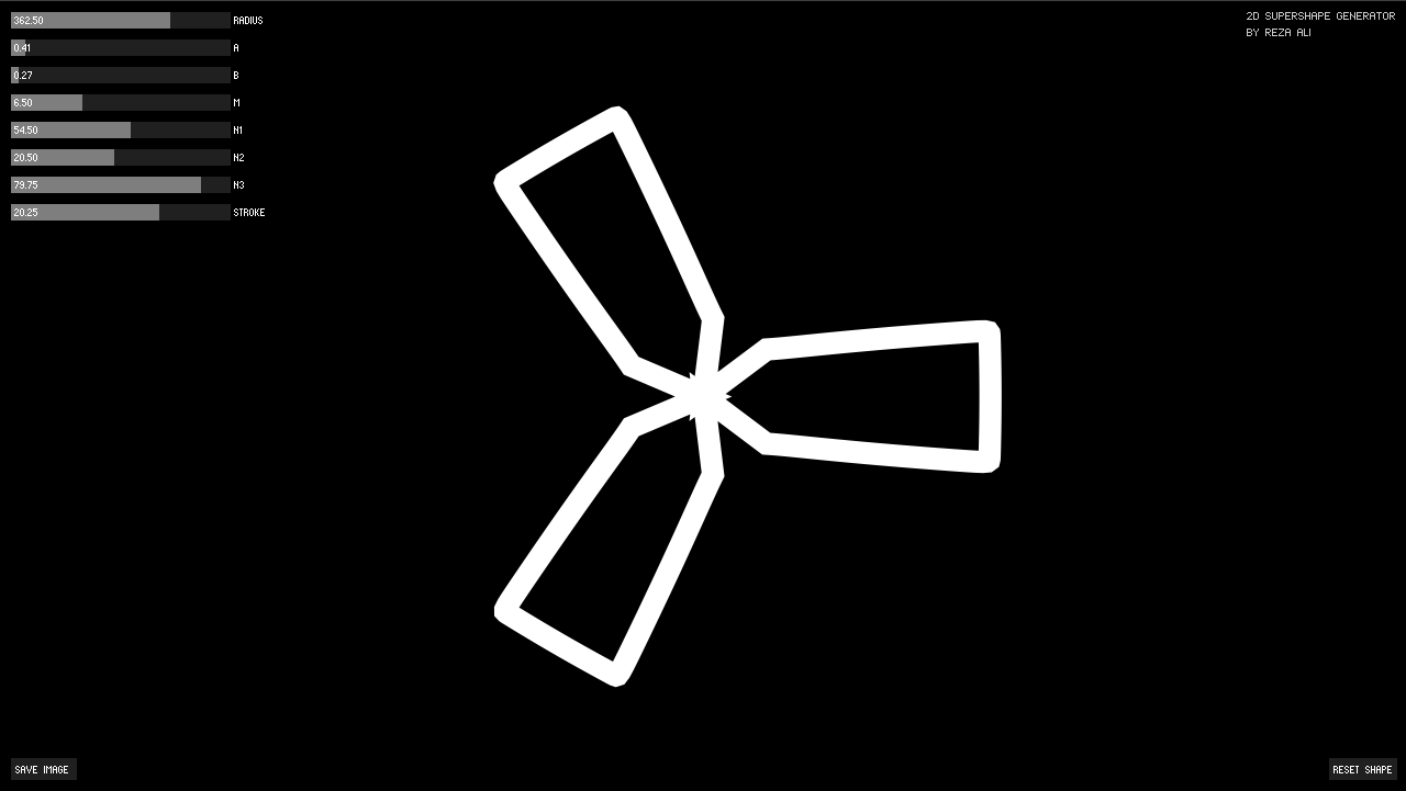 Super Shapes are intricate forms generated by evaluating the Superformula with varying input parameters. The Superformula produces visually stunning shapes that can be incorporated into more complex graphics or compositions (often seen in demoscene art). The application (shown below) is designed to be both interactive and minimal, allowing users to explore the diversity of these forms effortlessly.