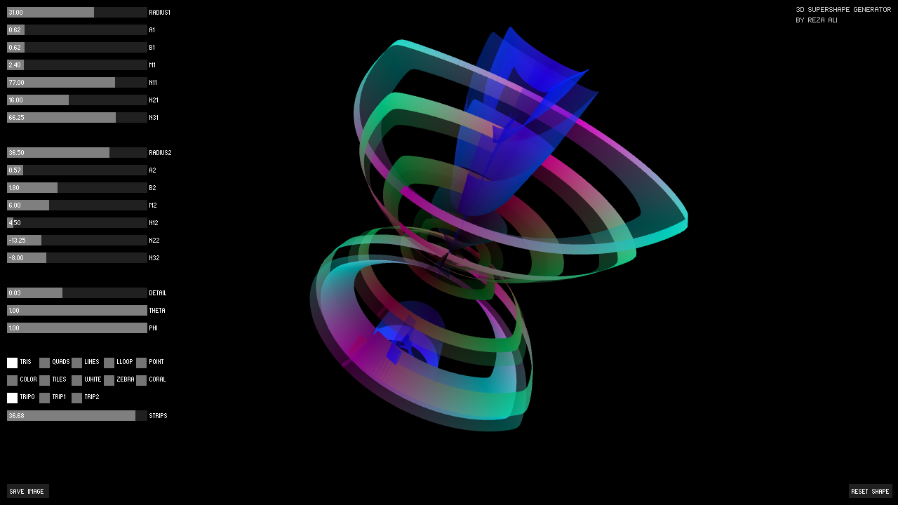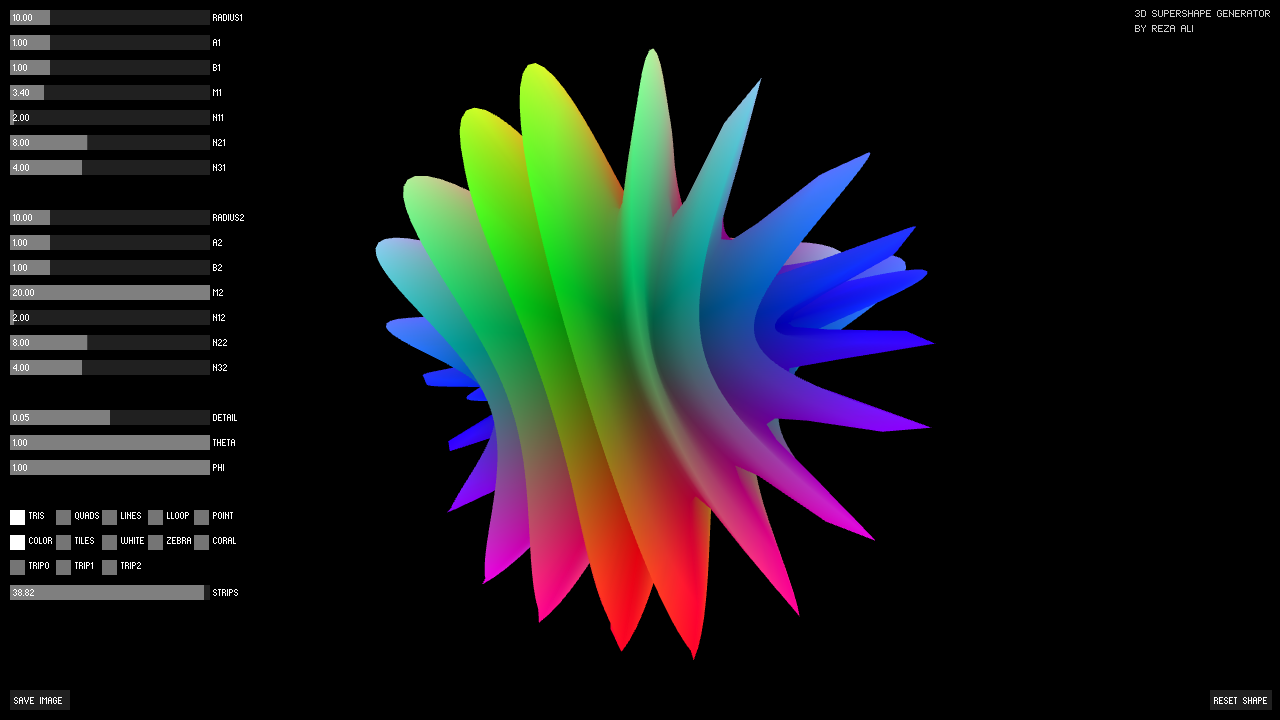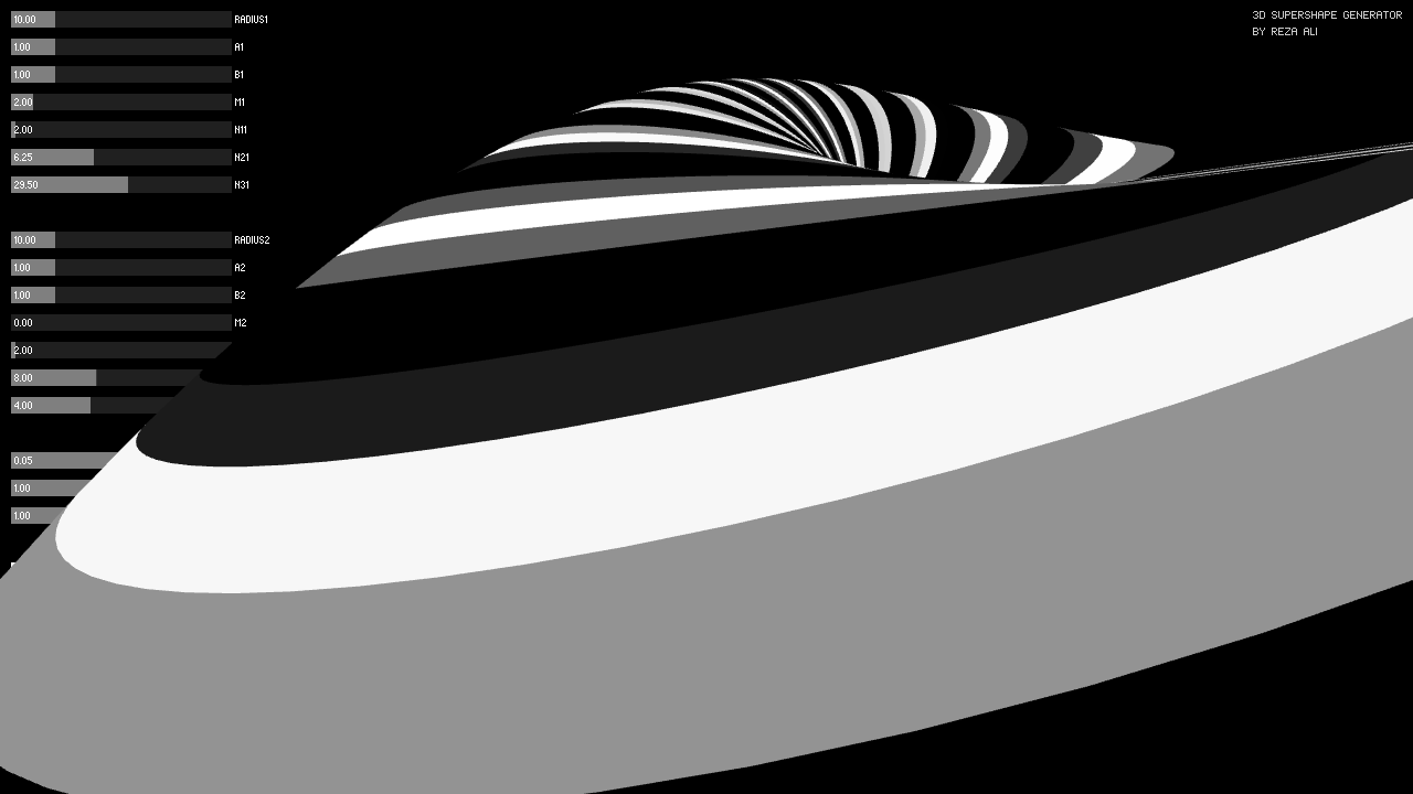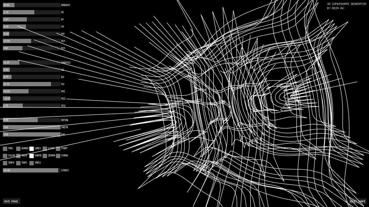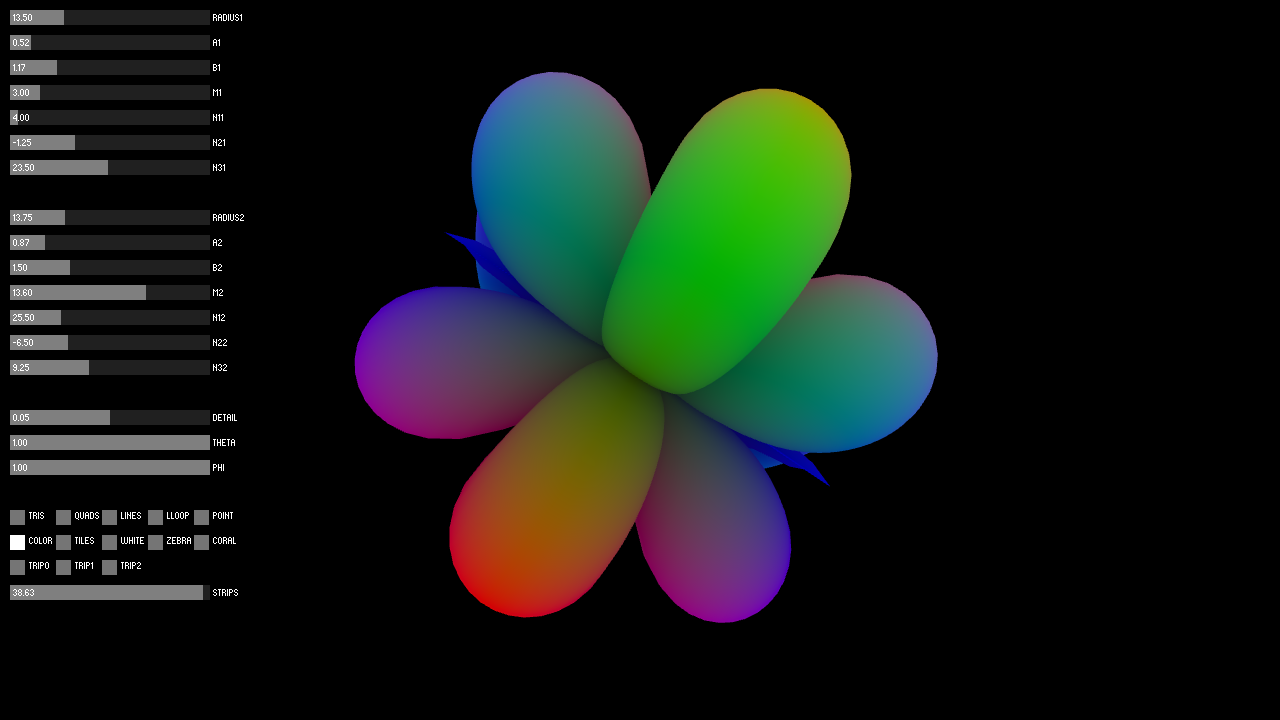 3D geometries generated using the Superformula. Created in Processing — the application allows users to adjust shape parameters and select different rendering styles.