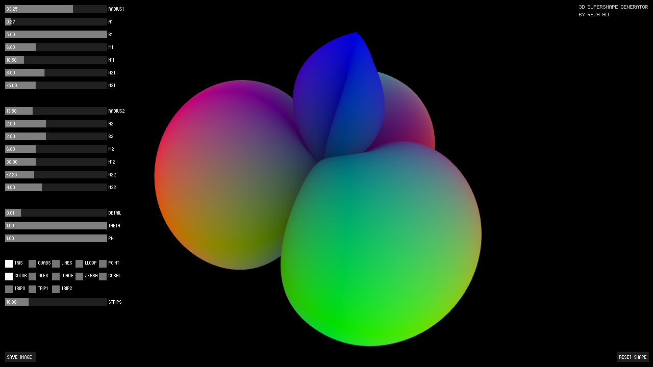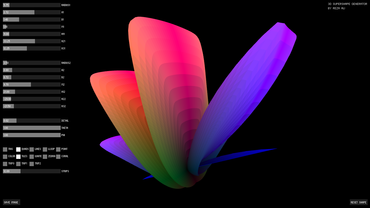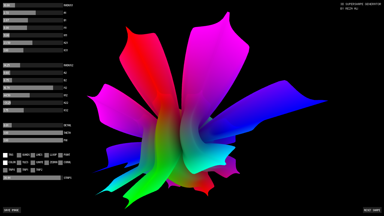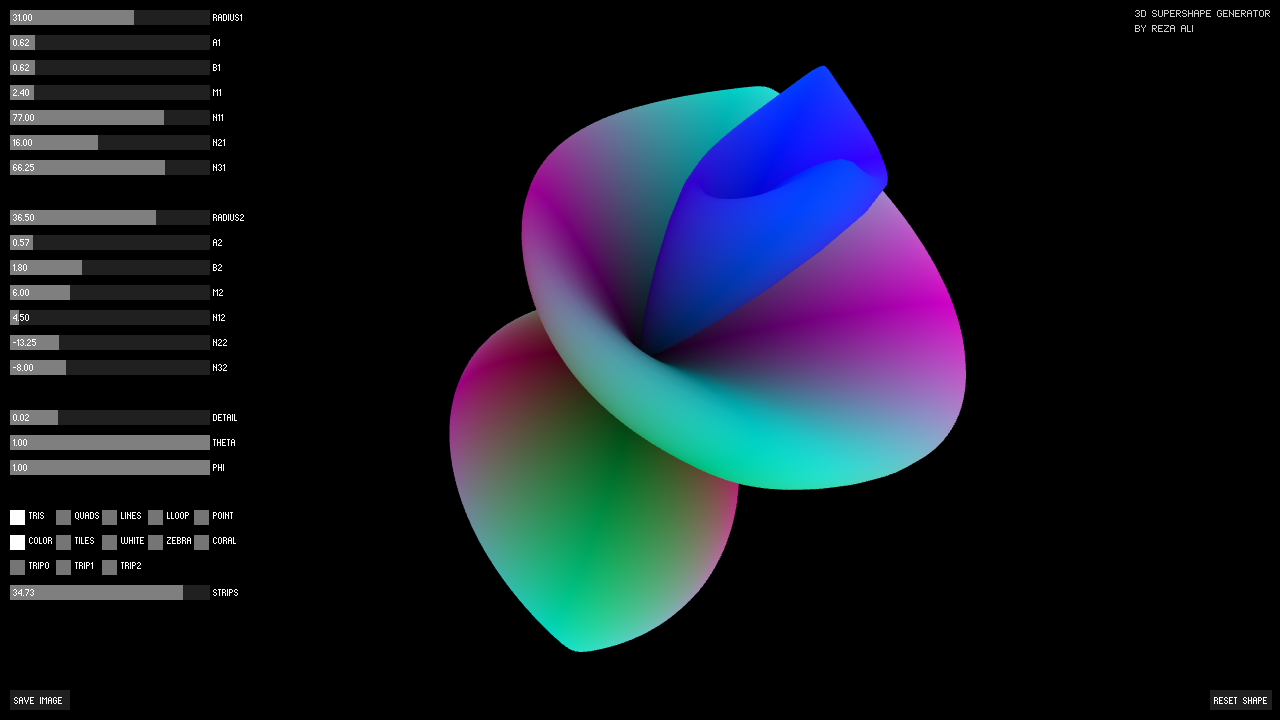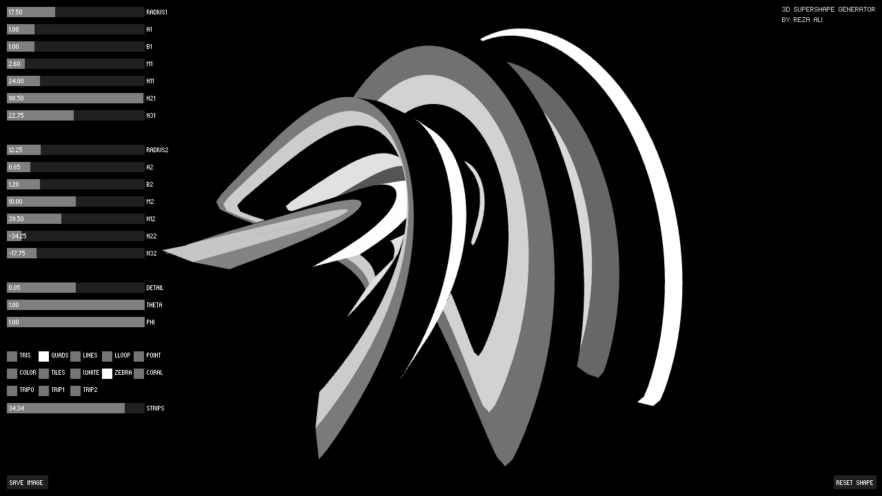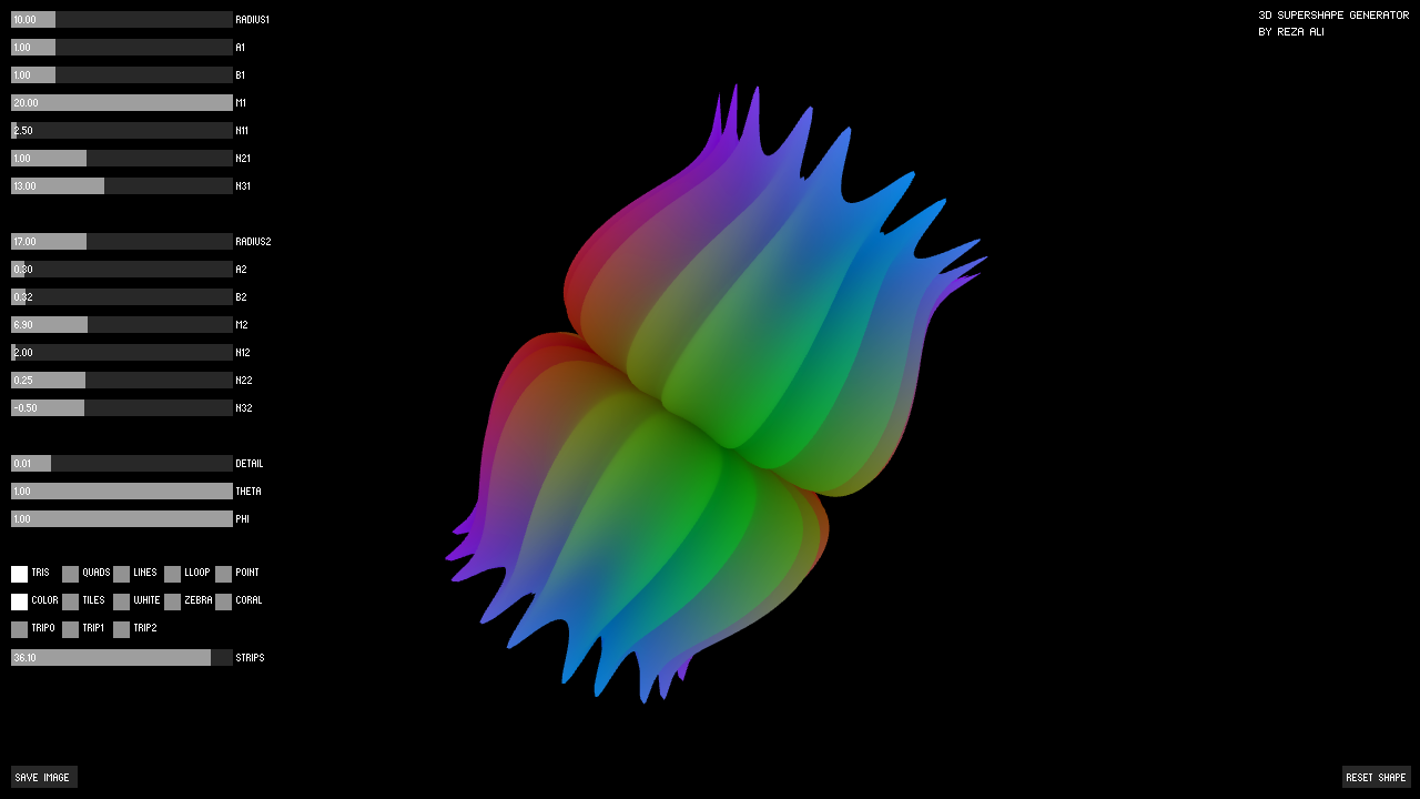 3D geometries generated using the Superformula. Created in Processing — the application allows users to adjust shape parameters and select different rendering styles.