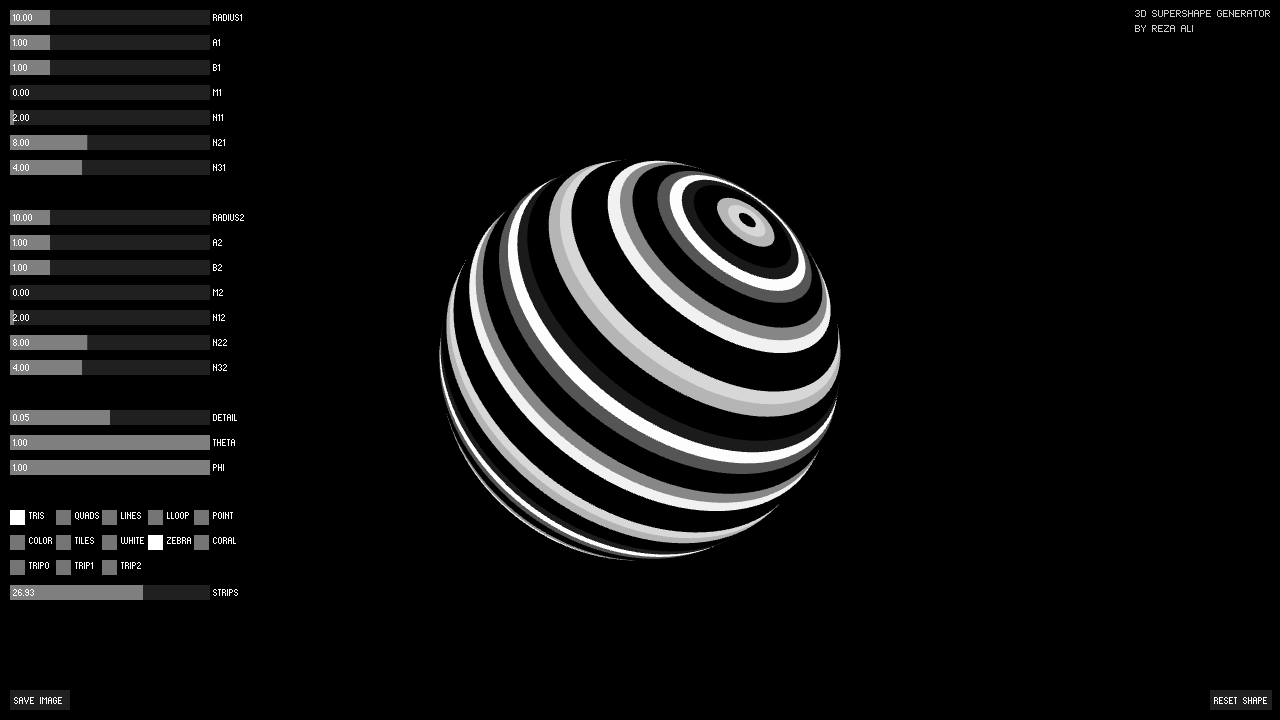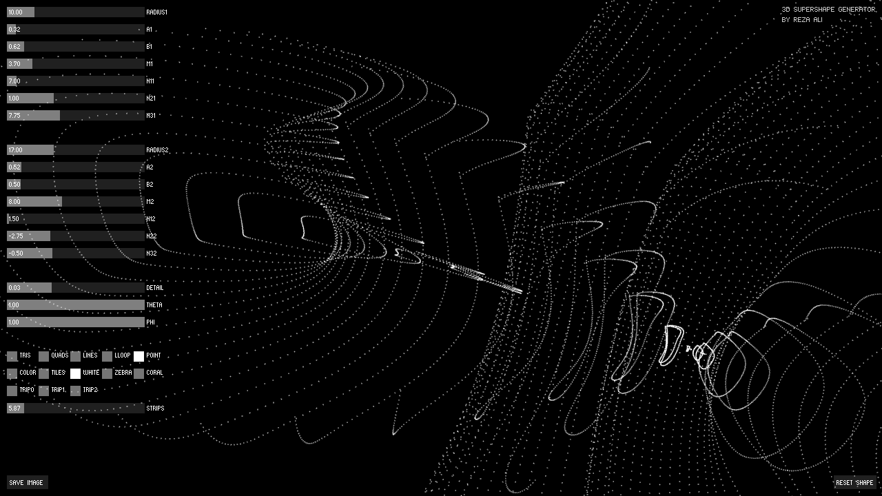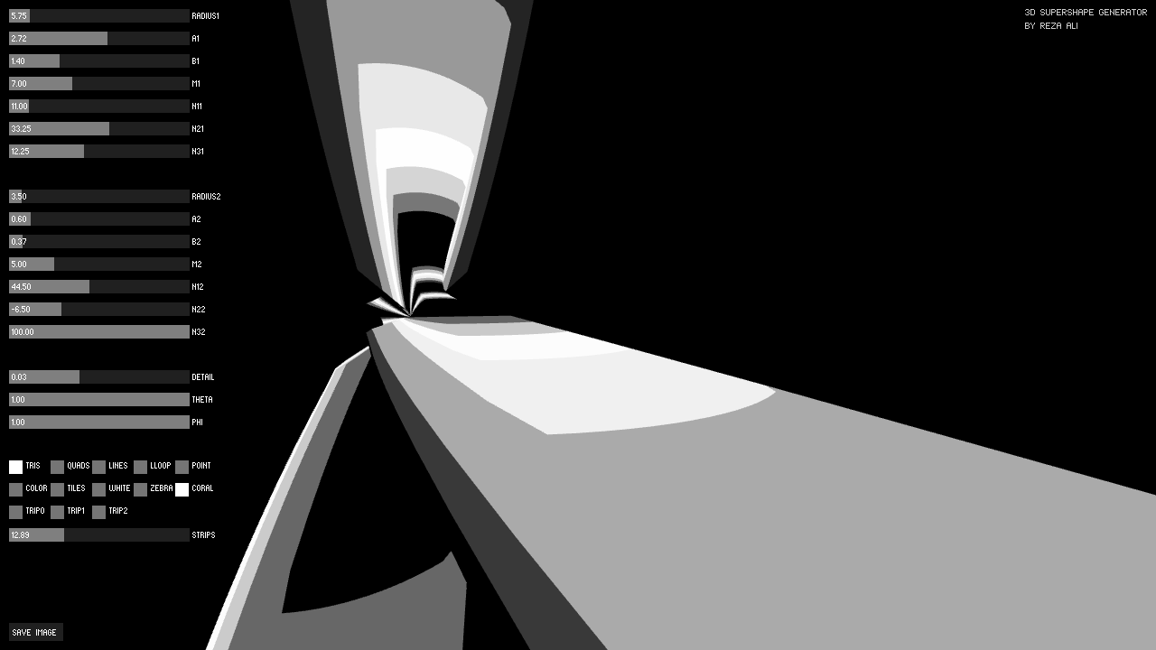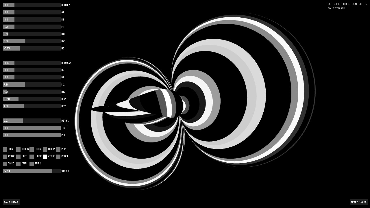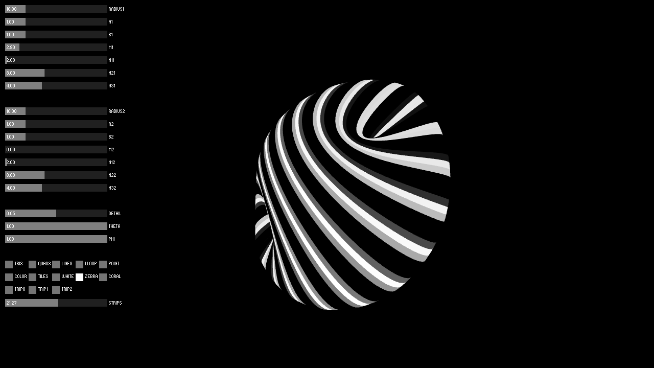 3D geometries generated using the Superformula. Created in Processing — the application allows users to adjust shape parameters and select different rendering styles.